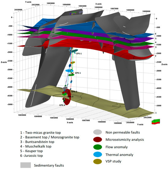 For this study, the model of Renard and Courrioux 1994 [10] was used as the basis. The horizons and regional faults provided in this model are based on vintage 2D seismic line interpretations. The horizons and regional faults of this model were loaded and reconstructed in Petrel. The well trajectories of GPK-1, GPK-2, GPK-3, GPK-4, EPS-1 and 4550 were also imported into the model. The two-mica granite layer [11] was also imported as a layer according to the depth in GPK-3 and GPK-4 where it was observed.
