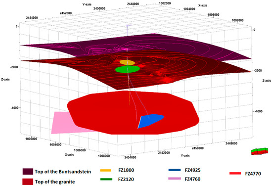 Feeding zones behind the casing have been reported [14] (in the upper granite reservoir section) for GPK-2 and GPK-3, connecting the well to its annulus from, respectively, 1431 and 1447 mMDGL to 4170 and 3988 mMDGL. As GPK-4 does not present any significant leaks in its casing between 1400 m and 4500 m, only its open hole below 4767 mMDGL is considered. The trajectory of GPK-2 and GPK-3 was taken from the top of Buntsandstein the bottom to take into account the known feed zones. Indeed, the cased section is cemented at the top and bottom only, and nearly the entire granite section can be considered an open hole. The Buntsandstein is then cemented but has been taken into account for its hydrothermal connection with upper granite via nearly vertical fault zones.