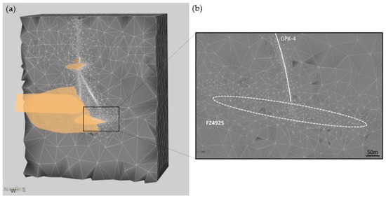 (a) Meshing of the 3D structural model and (b) magnification of the refinement meshing near GPK-4 and the fault FZ4925 (b).