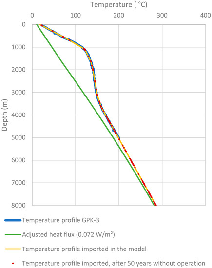 - A non-linear temperature distribution, varying with depth (Figure 5). As the model does not simulate convection and does not aim at reproducing long-term fluid flow, which would explain the observed temperature profile in Soultz (suggesting upwelling of hot fluid), the measured temperature profile at the wells was imported as a temperature distribution for the initial state. A simple transient hydrothermal simulation assuming no well use showed that this temperature profile remained almost unchanged over 50 years (see red points in Figure 5). Thus, within the timeframe of the simulation, the temperature distribution is representative of the real temperature profile of GPK-3 during the 30 years of simulations discussed in this study.