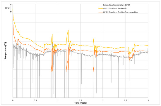 A sensitivity analysis was manually performed in order to calibrate the model. It highlighted the high impact of the fault hydraulic properties (hydraulic conductivity and thickness). The calibration was carried out in two steps. At first, the flow contributions of the faults and well pressures were fitted at best (see Table 3) using realistic parameters, in order to calibrate the fault transmissivity. Then, the hydraulic conductivity and thickness of each fault were adjusted, keeping the transmissivity of each fault constant. As a result, GPK-2′s production temperature could also be acceptably fitted (see Figure 6). It is important to mention that the output GPK-2 production temperature from FEFLOW is a mean temperature from the different contributions. Therefore, it was necessary to correct the FEFLOW output to take into account temperature losses in the well when the fluid circulates upwards over a few kilometers in the well in order to be able to compare the model results with observed temperature data (wellhead measurements). The temperature losses were calculated using a polynomial function of the flowrate and reservoir temperature, calculated using wellbore simulator HEX-B for the GPK-2 well [20]. The same work was realized on the input injection temperature for GPK-3 and GPK-4 (i.e., the input temperature given to FEFLOW is higher than operation values as it takes into account the heating of the fluid when going down in the well). It must be pointed out that numerical instabilities (oscillations) were observed in the calculated temperature after the shutdown/restart of the plant, inducing rapid fluid velocity changes in the model.