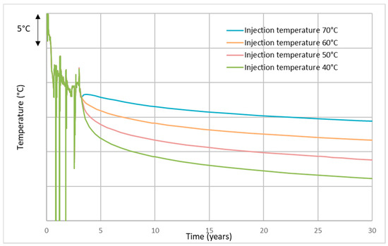 In order to calculate the reinjection temperature effect over a long period, the simulation was run over 30 years, including the first 3 years of calibration. Four runs were carried out, simulating reinjection temperatures of, respectively, 70, 60, 50 and 40 °C (see Figure 7).