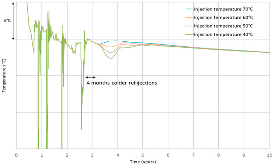 - A temporary decrease (over a few months) in the injection temperature does not affect the production temperature over a long time, as the production temperature returns to the initial production temperature after a maximum of 2 years.