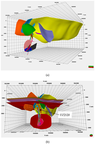 Thus, it was decided to update the local Soultz structural model by considering the 3D seismic interpretation results. In light of the seismic results, some faults in the granite included in the model, derived from imaging well data, are connected to regional-scale structures derived from the 3D seismic survey (see Figure 9), especially in the upper part of the reservoir (1500–2500 m—for example, FZ2120). This could possibly validate the contribution of the far field to the Soultz hydraulic system through the upper part of the reservoir. However, this update could also prove to be insufficient to reproduce the far-field contribution in the deep reservoir and show that connections to the far field exist in the deep reservoir but could not be seen in the 3D seismic data.