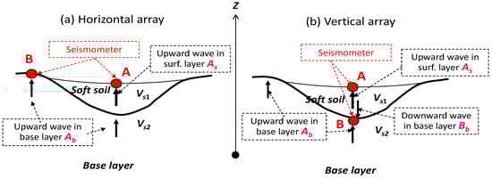 - Vertical array consisting of a surface and down-hole seismometers at the same place with exactly the same bedrock upward wave Ab. This can evaluate site amplification at exactly the same location but does not directly provide the amplification 2As/2Ab but another value 2As/(Ab + Bb) because the downhole record is more or less contaminated by the downward wave Bb from the overlying layers (e.g., Schnabel et al., 1972 [], Kokusho 2017 []). Here, Bb are amplitudes of downward waves in the soft soil layer. Hence, modification of 2As/(Ab + Bb) in the vertical array is necessary to evaluate the amplification 2As/2Ab for seismic zonation. In conducting the modification, it is required to pay attention to another important feature of the vertical array different from the horizontal array as described below.