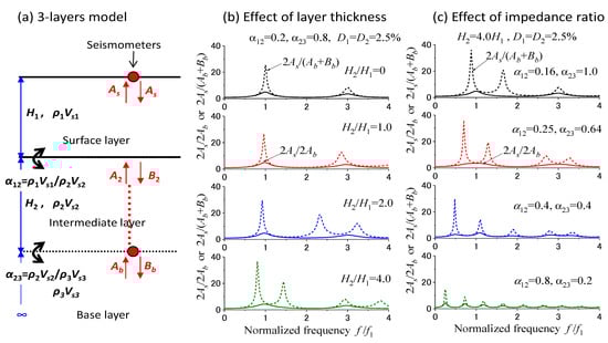 In order to clarify a basic principle of how peak frequencies in 2As/(Ab + Bb) and 2As/2Ab are governed by soil profiles, a simple one-dimensional three-layer model as shown in Figure 5a has been analyzed. An arbitrary in situ soil profile may be simplified by the model consisting of a soft surface layer (first layer: thickness H1), an intermediate layer (second layer: H2), and a stiff base layer (third layer) with infinite thickness. Wave amplitudes are As, A2, Ab upward and As B2, Bb downward, at the surface, intermediate, and base layers, respectively. The impedance ratios are  =  between the first and second layer, and  between second and third. The down-hole seismometer is positioned at the top of the base layer. The two transfer functions between surface and base, 2As/(Ab + Bb) and 2As/2Ab, are calculated for the model and shown in (b) and (c) against the normalized frequency f/f1 where f1 = Vs1/(4H1).