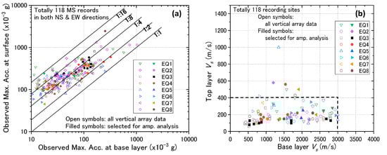 KiK-net records corresponding to 8 earthquakes (EQ1 to EQ8) utilized in this paper are listed in Table 1. The moment magnitudes Mw listed together with MJ (Japan Meteorological Agency magnitude) are varied from 6.6 to 7.9. A total of 118 mainshocks (MS) records during the eight earthquakes observed in vertical array sites near focal areas were firstly addressed. As shown in Figure 6a, the PGA-values in the vertical axis are spanning from 0.4 to 2.5 g, while maximum accelerations at the base are 0.01–1.0 g, leading to approximately 2–16 times amplification in maximum horizontal acceleration in terms of 2As/(Ab + Bb) between surface and base. Among them, those with filled symbols have been selected for the amplification analysis later on.