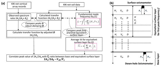 Flow chart developing amplification versus Vs-ratio correlation based on vertical array database (a), and concept for equivalent surface layer for first peak frequency (b).