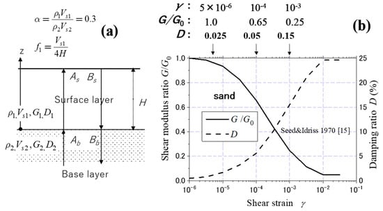 In taking into account the effect of strain-dependent soil properties on the amplification, the shear modulus degradation G/G0 from small-strain shear modulus G0, and the damping ratio D in the surface layer are parametrically changed; G/G0 = 1.0, 0.65, 0.25 and D1 = 2.5, 5 and 15%, for strain level of 5  10−6, 1  10−4, 1  10−3, respectively, assuming a typical degradation curve for sand (Seed & Idriss 1970 []) as indicated in Figure 14b, while in the base layer D2 = 0. The calculated results of 2As/(Ab + Bb) and 2As/2Ab are shown in Figure 15a,b, respectively. Here, the amplification between surface and base is shown versus the normalized frequency, f/f1, where f1 = first mode frequency of the surface layer for small strain properties (G/G0 = 1.0).