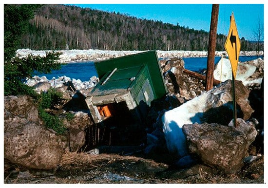 View of Saint John River and toppled shed of a hydrometric gauge at Dickey, Maine, USA, shortly after the April 1991 ice breakup (photo: S. Beltaos). Flow is from left to right.