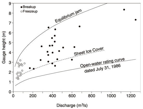 Apart from complexities caused by dynamic phenomena or by hanging dams, the peak stage occurring in any one ice season ranges between those generated by sheet ice cover and a fully developed or “equilibrium” jam [3], as illustrated in Figure 2. Data points located beneath the calculated sheet ice cover line likely reflect situations in which the peak stage occurred while the ice cover had largely melted away. The data point located above the equilibrium-jam line likely reflects imperfections in the theoretical calculation of ice jam stages for that site. Intermediate data points highlight the fact that equilibrium jams may or may not form at all, or perhaps they are located too far from the gauge site. An individual data point could also be due to the passage of a “jave”, a sharp wave generated by the abrupt release of an upstream ice jam.