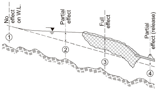 The sheet ice and ice jam “envelope” lines shown in Figure 2 can readily be calculated if local channel bathymetry and slope are known, using either analytical or numerical techniques [3,28,29]. The various ways in which an ice jam may affect the peak water level at a specific river site, say a gauge site, are illustrated in Figure 3 and described below.