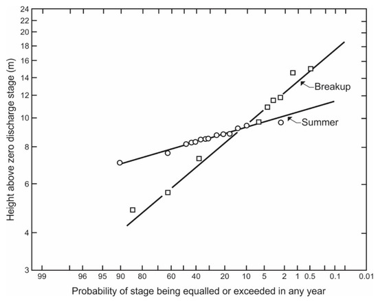 Cumulative probability distributions for ice-influenced and open-water annual peak stages; Peace River at Fort Vermilion, AB, Canada. From [1], with changes.