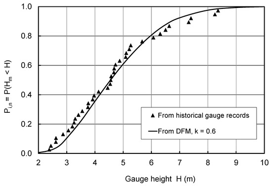 Once P(Q) and ϕ(η) are known, the probability Pi,n can be determined with little computational effort using a specially designed spreadsheet to assess the integral of Equation (6), as detailed in [20]. The end result of the DFM is illustrated in the example of Figure 5, where the simulated SFD is seen to be in good agreement with the data points, which derive from historical gauge records. The format of Figure 5 is clearly unsuitable for determining water levels associated with rare events. To accomplish this, the vertical scale may be adjusted to the range 0.9 to 1, with tick marks at 0.91, 0.92, …, 0.99. Corresponding stages could then be extracted from the modified graph and applicable return periods calculated as 1/(1 − Pi,n). For example, the 20-, 50-, and 100-year stages would correspond to Pi values of 0.95, 0.98, and 0.99.