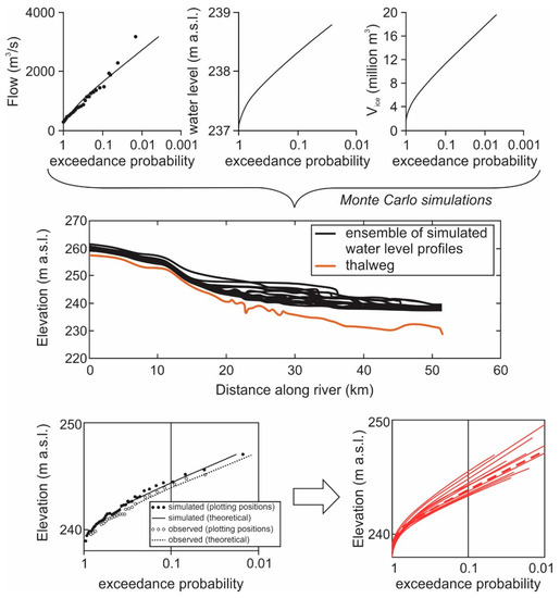 A highly sophisticated and complex approach has been developed and extensively applied by K-E. Lindeschmidt and co-workers during the last 10 years or so [21,47]. This is a stochastic Monte Carlo Framework (MOCAF), within which hundreds or even thousands of water level profiles under ice-jammed conditions are simulated using the model RIVICE, though any other ice-jam model can be used as well. First, RIVICE is calibrated using local information on water levels caused by ice jams, along with bathymetric and discharge data, taking into account the probability distributions of various model parameters. The model is then repeatedly applied with input parameters extracted randomly from frequency distributions of water discharge, volume of inflowing ice rubble, downstream water level, and ice jam toe location.
