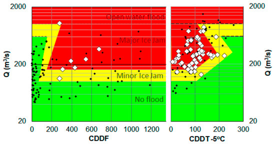 For several rivers in the province of Quebec, Canada, major ice jams and related floods result from both mid-winter and spring breakup events. It was postulated in [51] that, at any given river site, such occurrences are controlled by two factors: the discharge magnitude (Q), which is a breakup “driver”; and cumulated degree-days (CDD), which is an index of ice resistance to breakup. Daily averaged discharge data were obtained from Provincial hydrometric archives and maximum daily-average discharges associated with runoff events were multiplied by station-specific peak discharge factors, calculated from historical 15 min data. For each river site, Q is plotted versus degree-days (Figure 7) in separate graphs for mid-winter and spring breakup events, respectively, using degree-days of frost and thaw. On these graphs, different types of historical events are plotted using different markers, and regions of varying ice-jam risk are subjectively delineated.