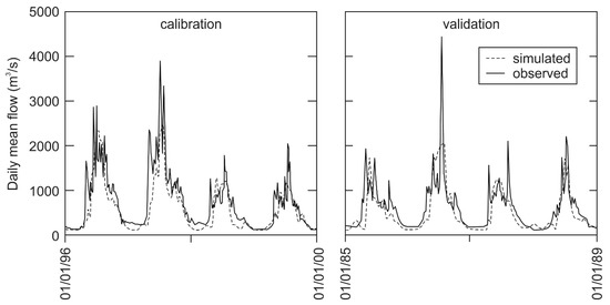 For ice-jam flooding applications, it is important to know both the magnitude and the timing of breakup (or freezeup) discharges. On the other hand, hydrological models often capture discharge magnitude, but not its timing, or they capture the timing but not the discharge magnitude. Figure 8 shows that the highly sophisticated MESH model does a fair job on spring discharge magnitude but not on timing, even after meticulous calibration [55]. Often, the simulated spring discharges arrive a month or so later than the observed discharges. A real ice jam, occurring in, say, late April due to increasing spring discharge that breaks up the winter ice cover, may cause a major flood (e.g., Fort McMurray, Alberta, Canada, 2020). If the simulated future discharge does not rise until late May, we would project that the winter ice cover would largely decay in place and disintegrate via increasing heat inputs (“thermal” breakup).