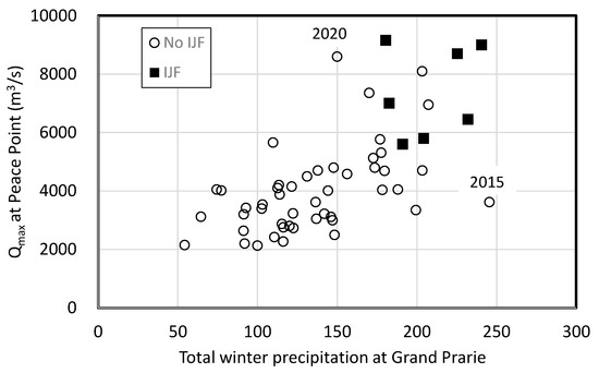 Peak breakup discharge (Qmax) at Peace Point, AB, Canada versus total winter precipitation (Nov. to Apr.) at Grande Prairie, AB, Canada for the years 1962–2020, excluding the Bennet Dam reservoir-filling period, 1968–1971. Total winter precipitation data are from [23]; discharge data are from Water Survey of Canada records Historical Hydrometric Data-Water Level and Discharge-Environment Canada (ec.gc.ca). Accessed 25 October, 2021.