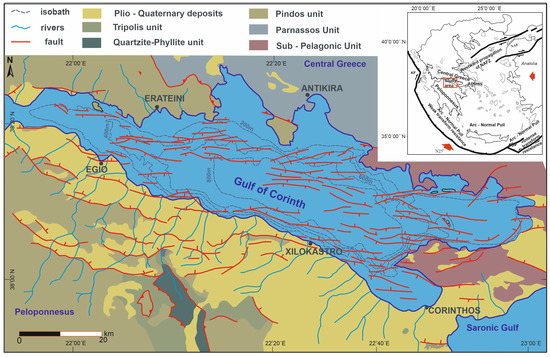 Simplified map of the Gulf of Corinth (modified by [13,14]). The inset figure shows the geological setting of the study area.
