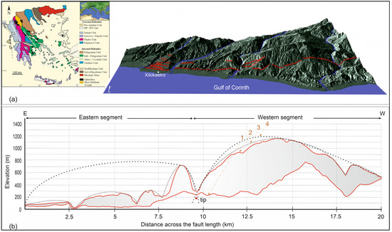 The evolution of tectonically controlled landforms and the way active tectonics of an area are imprinted has caused a great deal of research by and discussion among the scientific community [1]. Understanding the geometry of faults, the interaction between faults, and the sensitivity of river systems to tectonic movements becomes extremely important in determining the active tectonics of an area [2,3,4,5,6]. Therefore, its associated hazards, such as tectonic movements, liquefactions, and floods can be predicted as well. Fault growth, whether achieved by the joining of smaller cracks or by radial widening of a pre-existing fault, is a process with numerous stages of development, most of which cannot be detected. However, the use of geomorphological methods in areas of active tectonics, which are associated to strong seismicity, leads to conclusions and quantifies the changes in the terrain along a fault, and it can be an indication of the slip rate in an active fault.