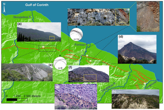 The geomorphological structure between Corinth and Xilokastro is characterized as relatively mild as it forms rivers and marine terraces [16]. In this area there are no densely ruptured slopes resulting in the mild morphology of the relief [8,16,21]. These terraces cover a large area and are limited to the west by the impressive ruptured slope formed by the action of the Xilokastro fault. Its trace is located in the area southwest of the coastal city of Xilokastro. Its length reaches almost 20 km but its most impressive slope is set at 11.6 km, where in this area the fault scarp is impressive and is estimated at 0.8–1 km (Figure 2a). It is characterized by normal sense of movement in an almost W-E orientation, dipping to the north. It is composed of an onshore and an offshore part [71,72]. The offshore part, which does not exceed 6 km in length, shows, according to underwater geophysical surveys, a slope height of 580 m ([50]; Figure 2b) and is related to the deposition of modern turbidites towards the centre of the trench of The Gulf of Corinth that come from high sediment supply of rivers draining the area east of Xilokastro [71]. Its onshore part is not uniform but shows high segmentation (Figure 2b). According to [73], the Xilokastro fault is probably the boundary between the deformation that diffuses into several faults in the western part of the Gulf of Corinth and the eastern one in which the deformation is now hosted in a small number of faults that are mainly located within the offshore part of the gulf. The main phase of its activity is occurred approximately 1.5–0.7 million years ago [20,52]. Its surface trace based on extensive field work showed the existence of segments with length 500–2500 m. The western end of the fault shows larger sections of faults than the eastern one. In addition, its topographic detection (Figure 2b) decreases dramatically at the eastern end of the fault. The value of maximum topographic elevation reaches 1180 m, while the separation between the eastern and western part is evident, accompanied by a corresponding reduction in displacement. The Fonissa River flows in between the two prominent segments of the fault (Figure 2 and Figure 3). The maximum visible displacement along the fault is approximately 900 m and is located in the western part (Figure 2b). The fault footwall consists of Mesozoic limestones [74,75] in its western part, whereas in the eastern part there are elevated marine terraces (Figure 3). Surface scarps appear in the western part of the fault (Figure 3b,c,e). Curvatures are identified on these surfaces, whereas slip lines are compatible with the normal sense of motion of the fault (stereographic projections in Figure 3). The footwall of the fault is bounded by colluvial deposits that include clay formations with scattered conglomerates (Figure 3f,g). Towards the east, in its footwall Pleistocene marls and conglomerates are exposed (Figure 3h).