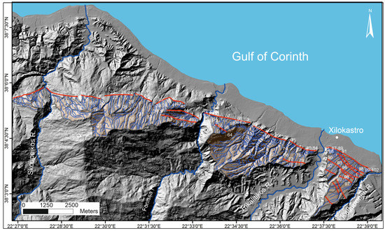 Across the orientation of the Xilokastro fault, 102 catchments were identified that dissect the fault almost perpendicularly. The main morphotectonic indices were calculated (Table 1). The runoff direction of each basin is considered to be the same as the general N-S orientation of the extension. However, there is a change in the lithology that is eroded between the eastern and western part of the fault, whereas the effect of climate is considered similar along the entire fault. The drainage network is characterized from parallel to sub-parallel, attributing its formation mainly to the fault evolution. The catchments show a variety of sizes and shapes (Figure 4). The fault is also drained from the four major catchments of the rivers Skoupeikos, Fonissa, Trikalitikos, and Katharoneri of general direction N-S whose runoff has also been affected by the action of the Xilokastro fault according to [37], forming wind and water gaps in the past.