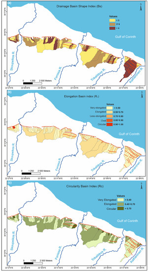 We examined the spatial distribution of the catchment shape factor Bs based on the calculation of the length to the width of the catchment and not its surface. The catchments can be separated in more detail, into very long ones that have values higher than 4 and are connected to high percentages of active tectonics. A second class of basins are classified as elongated with values in the interval 3–4, which indicate active tectonics, and others that are less elongated and have values lower than 3. These less elongated basins are characterized by lower active tectonics. According to this classification of [89], approximately 60% of the catchments along the Xilokastro fault (Figure 5a) show evidence of active tectonics based on their shape, which in most of them is characterized as elongated. In addition, both the catchment area elongation index RL and the circularity index of the catchment area RC prove that almost all the basins along the Xilokastro fault can be characterized as elongated to very elongated (Figure 5b,c). Therefore, the drainage of the fault footwall is mainly formed from the main branches of the basins by direct discharge of the secondary branches to the main branches, which will show high erosion capacity.