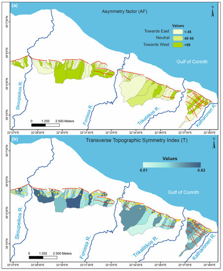 Therefore, both areas around the river systems of Fonissa and Skoupeikos are affected by the fault’s activity. Τhe analysis of the transverse topographic symmetry index T for all catchments along the Xilokastro fault includes the calculation of a vector that has size and orientation. The spatial distribution of these values is shown in Figure 6b, which also shows the orientation of the mean vector with a yellow arrow. As can be seen, the individual trends shown by the AF basin asymmetry index are also confirmed by the orientation of the mean vectors determined for the transverse topographic symmetry index T (Figure 6b). A characteristic example is the area around the Skoupeikos River, where strong values of asymmetric slope according to the asymmetry index AF and similar orientation of the mean vector of the index of transverse topographic symmetry T (Figure 6).