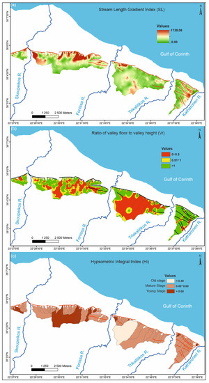 Geomorphological indices have been used systematically to evaluate active tectonic structures in various parts of the world ([58] and references therein). The structures primarily used in the geomorphological analysis are the active slopes, the river basins, and the drainage networks. Internal tectonic processes deform the Earth’s surface, whereas external processes shape the final morphological expression. Any disturbance caused by these processes alters the dynamic equilibrium of the system, which can be observed in the properties of river networks that drain tectonically active slopes [6,76,77]. In particular, river basins represent dynamic systems that can provide evidence of the formation and evolution of a tectonic structure [78,79]. The numerical representation of the topographic features is implemented through mathematical relations that can be divided into two sections (spatial and tectonic geomorphological indices), depending on the parameters of each index [80,81,82,83].