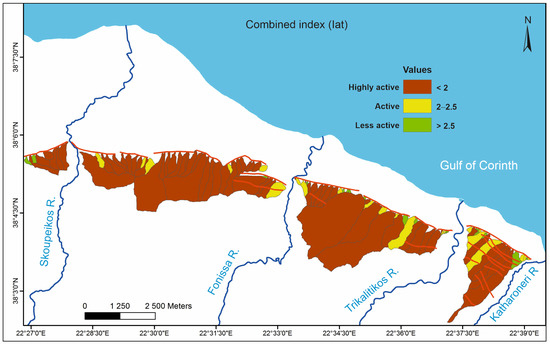For the overall assessment of the active tectonics in the whole area of the Xilokastro fault, the geomorphological indices were joined in a combined index Iat. These are the basin-shaped coefficient indices of the catchment area Bs and the tectonic morphometric indicators except the index of the transverse topographic symmetry T. The index distribution identifies the most active sections of the fault via ArcGIS by presenting a rather simplified map of tectonic activity along the fault (Figure 8). Based on the distribution of the combined index Iat, its values that are less than 2 represent high tectonic activity. Areas with high tectonic activity occur in both the western and eastern part of the fault, although the steepest slopes in the topographic profile are observed in the west. However, both the findings from the SL stream length-slope index for the western part and those of the valley floor-to-height ratio for the eastern part are compatible with the distribution of the combined index. In addition, special note should be made of the areas that flow through the rivers Skoupeikos, Fonissa, Trikalitikos, and Katharoneri. Except for the area of Skoupeikos, where high tectonic activity occurs in other areas, the active tectonics is clearly lower. Considering the AF basin asymmetry index, the creation of an overlap zone is evident, especially in the area of Fonissa, and is also seen in the Skoupeikos area. As for the eastern and western boundary of the fault, they seem to disappear in the area and therefore the results of the geomorphological analysis do not support either the merging with the submarine part of the fault to the east or the westward propagation of the fault. Similar observations were made for the Xilokastro submarine fault by [41,50] and for the western part of Xilokastro and its possible merge with the Valimi fault by [20,52].