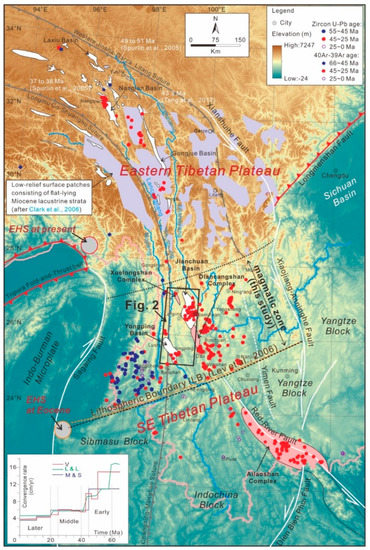 Numerous Cenozoic basins, in addition to a large amount of small-scale Cenozoic plutons, were identified in the 1970s and 1980s by geological mapping of the eastern and southeastern Tibetan Plateau on the scale of 1:200,000 [47]. Accumulation of geochronological data of modern technologies reveals the spatial and temporal distribution of these Cenozoic units that helps us to suggest a new tectonic division of the eastern and SE Tibetan Plateau (Figure 1).