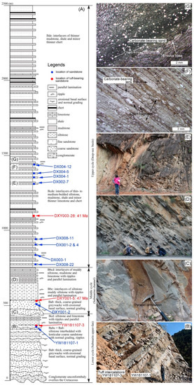 The lower cycle consists of light-gray, massive- to thick-bedded, medium- to coarse-grained litho-feldspatho-quartzo sandstones [78] in the lower part (~250 m thick) and siltstones with two sandy limestone intercalations (each ~2 m thick) in the upper part (~150 m thick). The sandy limestones consist of carbonate extraclasts. Irregular erosive bases, normal grading, and parallel laminations are common in the coarse-grained sandstones, and ripple laminations are well preserved locally in the siltstones. We interpret these turbidites as a Bouma sequence [79] of Bab and Babc, representing the underwater upper-fan succession overlying the debris flow deposits. Tuff-bearing horizons are common in the outcrops, which contain abundant biotite crystal fragments (Figure 3B).