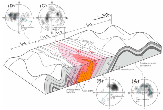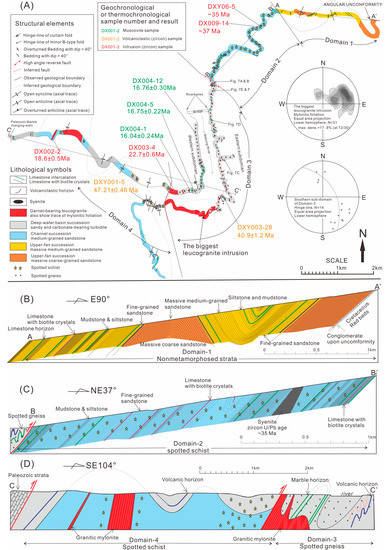 In spite of the relatively high-grade metamorphism, sedimentary beddings are still well preserved, which is a common feature of contact metamorphosed rocks. The trends and dips of bedding in this domain are highly variable, and the structures are complex. The spatially variable structures of this domain seem to be closely related to the shape of the biggest leucogranite (Figure 4A). Two subdomains are subdivided accordingly. The western bank of the Mekong River that lies in the north of the biggest leucogranite defines the western subdomain, which displays an overturned syncline to the west and an overturned anticline to the east (Figure 4D). The latter is partly destroyed by the Mekong River. The folds are both one hundred meters wide, north–south trending, and eastwards-verging. E–W trending, open to tight small reclined chevron folds have superimposed upon them (D-3, Figure 6 and Figure 8D). The eastern subdomain is located in the east of the largest leucogranite, and it features numerous small-scale overturned to recumbent folds and high-angle reverse faults (Figure 4A). These small-scale folds are mostly eastwards-verging. Projections of their hinge lines form a great circle on a stereograph (Figure 4A, inset), suggesting the hinge lines plunge within a SWW-dipping plane although they appear to be randomly oriented in map view.