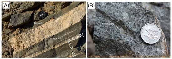 The leucogranites are light gray and consist predominantly of feldspar and quartz and minor oriented tourmaline needles. Euhedral garnets are widespread although their modal content is not higher than 3% (Figure 5A). Of note, the relatively larger leucogranites that occur in outcrops greater than 10 m in width have all been ductilely deformed, whereas leucogranite dikes that are less than 1 m wide are undeformed (Figure 5A). The syenite consists of K-feldspar, plagioclase, clinopyroxene, and biotite, which also have not been deformed (Figure 5B).