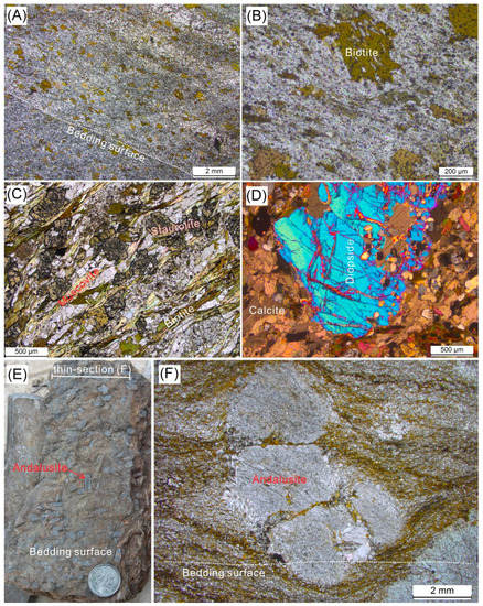 Photomicrographs of contact metamorphosed and deformed rocks. (A,B) Spotted schists in which the porphyroblasts are entirely biotite (plane polarized light). (C–F) Spotted gneiss in which the porphyroblasts vary from staurolite ((C), plane polarized light) to diopside ((D), cross polarized light) or andalusite ((E,F), plane polarized light) depending on the bulk composition of the rock. In a bedding surface, the elongate porphyroblasts are randomly oriented (E). See Figure 4A for the location of each sample.