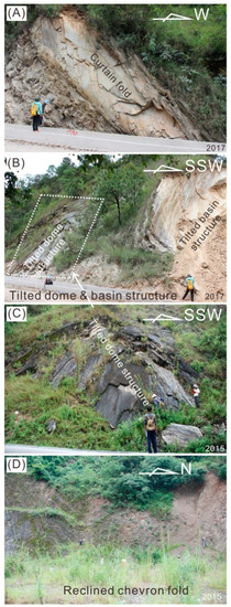 Field photographs showing (A) a reclined curtain fold, (B) a tilted dome-and-basin structure, (C) the dome of the dome-and-basin structure of (B) in Domain 2, and (D) the reclined chevron folds that superposed upon the earlier stage overturned folds. Note that the pictures of (B,C) were taken at different times, so that they do not exactly match.