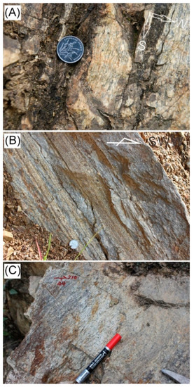 Field photographs of mylonitized leucogranite. (A,B) are the views of the horizontal and the vertical surfaces, respectively. (C) is the view of a mylonite-foliation-parallel surface. No stretching lineation is evident but slickensides developed on the foliation.
