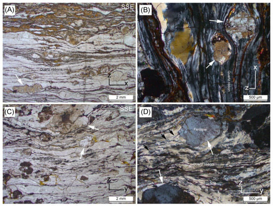 The strain of the leucogranite is mainly concentrated in the quartz whereas the feldspar grains are weakly deformed (Figure 10A–D). The boundary between the highly stretched quartz and weakly deformed feldspar grains is generally sharp and smooth. Quartz grains form ribbons that wrap around the slightly elongate feldspar grains. New grains within the quartz ribbons show highly irregular boundaries (Figure 10B,D), suggesting that grain boundary migration (GBM) took place as the dynamic recrystallization mechanism under high-temperature conditions (500–700 °C; [80]). The estimated temperature of deformation is comparable to that of the contact metamorphism, as indicated by the coexistence of andalusite and sillimanite (>500 °C) [81].