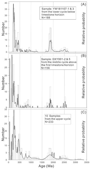 Probability density plotting (PDP) with optional histograms of the 206Pb/238U (<1000 Ma) or 206Pb/207Pb (>1000 Ma) ages of zircons in sedimentary rocks of the lower cycle (A), the middle cycle (B), and the upper cycle (C) with bin width = 50 Ma of the Yongping basin, Southeastern Tibetan Plateau. See Figure 3A for the stratigraphic locations of samples.