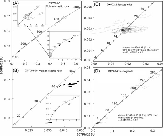 Samples DX003-4 and DX002-2 were collected from the biggest leucogranite and a smaller intrusion (Figure 4A), respectively, for zircon separations and U-Pb dating. Most zircon grains from both samples are small with a length of <100 μm and variable aspect ratios between 1 and 3. Sixteen of 27 analyses of 27 zircon grains of sample DX002-2 yielded concordant results. Six concordant results with the youngest ages form a tight cluster with a weighted mean 206Pb/238U age of 18.6 ± 0.5 Ma (MSWD = 0.22) (Figure 12C). Thirty analyses of 30 zircon grains from sample DX003-4 yielded 13 concordant results, six of which formed a tight cluster with a weighted mean 206Pb/238U age of 22.67 ± 0.63 Ma (MSWD = 1.02) (Figure 12D).