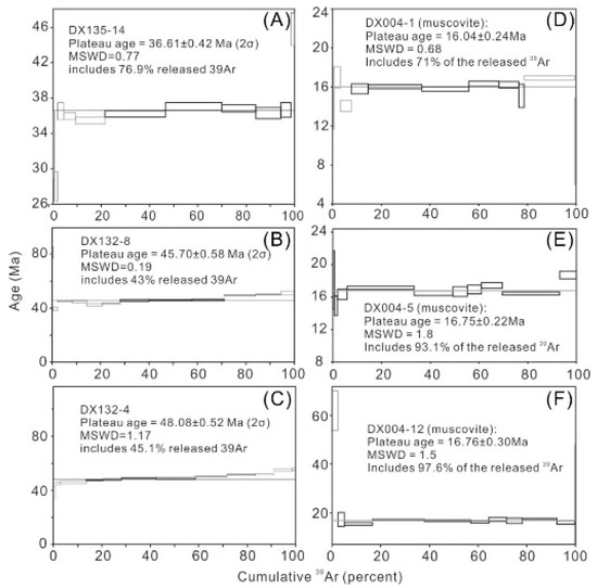 Analyses of biotites derived from three lamprophyre samples show spectra with a slight Ar loss (Figure 13A–C). Their preferred ages (PAs) are 48.08 ± 0.52 Ma (including 45.1% released 39Ar, MSWD = 1.17), 45.70 ± 0.58 Ma (including 43% released 39Ar, MSWD = 0.19), and 36.61 ± 0.42 Ma (including 76.9% released 39Ar, MSWD = 0.77). Their isochron ages are the same as the preferred ones, within analytical error.