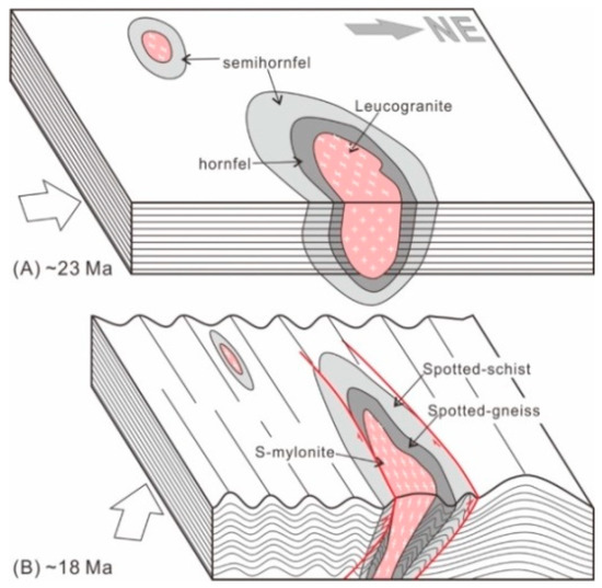 In summary, spotted gneisses were developed exclusively to the north and east of the biggest leucogranite body. The gneiss and the biggest intrusion are surrounded by spotted schists (Figure 4), showing an aureole of contact metamorphism. The development of both andalusite and sillimanite suggests that the spotted gneiss formed under the P–T conditions of >500 °C and <3 kbar [81]. The spatial distribution of the metamorphic zones in the aureole is unusual, and is probably related to the syn-intrusion deformation.