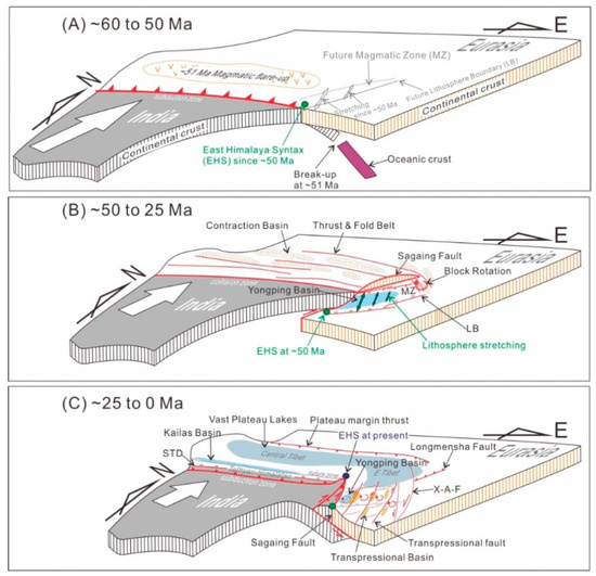 The observations outlined above suggest that two tectonic transitions in the early Eocene and in the earliest Miocene, respectively, divide the tectonic evolution of the Tibetan Plateau into three stages. The nature of the transitions is the key to understanding the dynamics of the India–Eurasia collision [2,28,29,30,32,44,45]. The long-lived “steady-state” nearly S–N compressional regime of the orthogonally collisional Tibet-Himalaya has left little in the way of diagnostic information regarding these transitions, but such information is probably recorded by the spatial and temporal variation in crustal deformation of the obliquely collisional SE Tibetan Plateau, given its northwards growth [4,46].