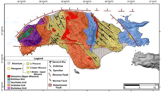 - Theodoropoulos, D. Geological Map of Greece, 1:50.000 Scale; Neon Karlovasi and Limin Vatheos Sheets; IGME: Athens, Greece, 1979. [Google Scholar]