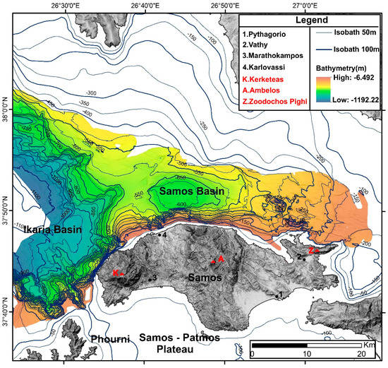 The specific morphotectonic structures along the northern coastal zone of Samos Island can be observed in three segments, corresponding to (a) the southeastern margin of Ikaria Basin, (b) the western part of the southern margin of Samos Basin and (c) the eastern part of the southern margin of Samos basin (Figure 6).