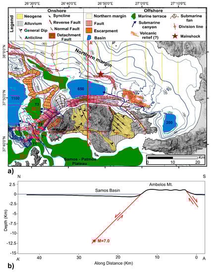 (a) Morphotectonic map of Samos Island and Samos Basin. (b) N-S cross section through the Samos Basin and Samos island. The E–W marginal fault is dipping to the north with 45°. The focus of the mainshock of magnitude 7.0 is shown at 12 km depth. The fault plane solutions of the October 30th seismic sequence [10] generally show E–W normal faulting (Figure 6a). The main shock (Magnitude 7.0) and most of the aftershocks (Magnitudes 5.2–3.9) occur in the central and eastern part of Samos Basin, forming a 20 km long seismic belt, which is smaller than expected for this magnitude (following the empirical relationships [45]). However, it is remarkable that: (i) there are no (large) aftershocks in the western part of Samos Basin, (ii) there are some aftershocks with similar plane solutions onshore in the eastern part of Samos Island, south of the major fault zone and (iii) there are some aftershocks at the eastern part of Ikaria Basin with the indication of strike-slip components besides E–W normal faulting. Thus, the aftershocks (of magnitude >3.9) indicate a “seismic gap zone” of about 20 km length extending from the Eastern Ikaria Basin up to the central Samos Basin. The focal depths indicate a seismic layer at a uniform level at 12–13 km in the activated area. Thus, the activated fault should have an average dip of 45° to the north, as shown in the N–S tectonic profile through Samos Island and Samos Basin (Figure 8b). This tectonic structure is compatible with the morphotectonic analysis and the very steep slopes of the Samos margin.