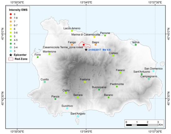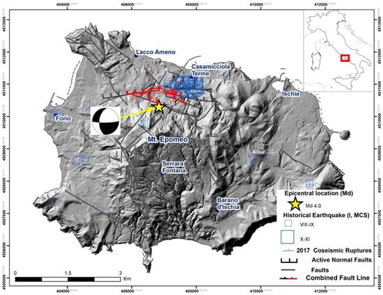 The 21 August 2017, Md 4.0 Casamicciola Terme earthquake (Latitude N40.74°, Longitude E13.90°) [1] (Figure 1) is the first damaging earthquake recorded on the volcanic island of Ischia (Gulf of Naples, southern Italy) along the instrumental era. The earthquake occurred during the summer season, at 19:57 GMT, with peak tourist presence in the Ischia Island. The hypocentral depth was very shallow, about 1.2 km; focal mechanism and geological effects strongly suggests an E-trending, steep normal fault plane as the seismogenic source [2,3,4] (Figure 1 and Figure 2). The main event was followed by 27 aftershocks in the following months, characterized by Md between 0.7 and 1.9.