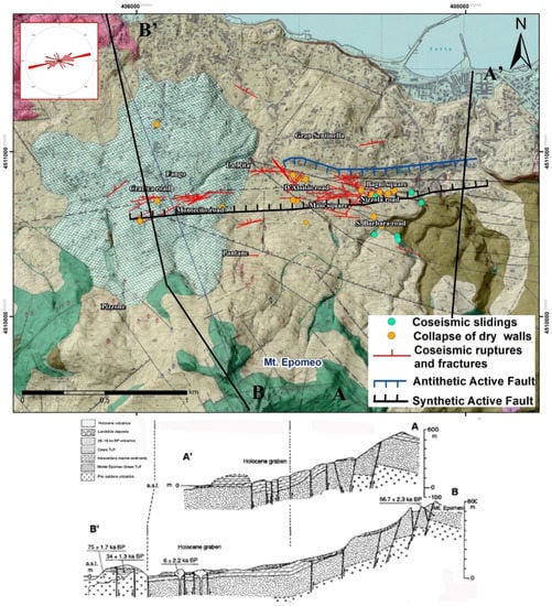 Top, map of the coseismic ruptures, secondary environmental effects and collapse of drywall (data reported because located in the immediate vicinity of ground effects) in the epicentral area of the 21 August 2017, earthquake [4], overlapped on the geological map of [16]; black line is the synthetic active fault and blu line is the antithetic Holocene normal fault scarps of the Casamicciola Terme graben (ticks mark the downthrown side); bottom, geological cross-sections of the epicentral area, with structural details of the Holocene graben [9], trace location on the top.