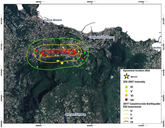 The spatial distribution of the environmental effects of the earthquake (EEE) and the isoseismal map confirms that the area between Fango (Lacco Ameno) and Piazza Bagni localities (Figure 2 and Figure 5) is the epicentral area. It is important to note that in the epicentral area of damaging earthquakes, when compared with traditional intensity scales the ESI intensity map generally shows a steeper attenuation in the near field (e.g., [27,69]). Therefore, ESI intensity typically provides better constraints on the location and geometry of the seismic source.