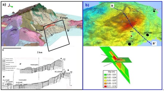 Comparison between the observed (on the left) and InSar modeled deformation due to the 2017 Casamicciola earthquake; (a) geological map of [16] overlapped on the 3D terrain model of Ischia island; note the trace of geological sections A′A and B′B shown on the bottom [32]; the black rectangle represents the fault plane of the 2017 Casamicciola earthquake source, as defined in the present study; (b) on the top, InSAR surface deformations along the section B-B’ on the flank of Mt. Epomeo and on the bottom, the [70] analytic model of the 2017 Casamicciola source.